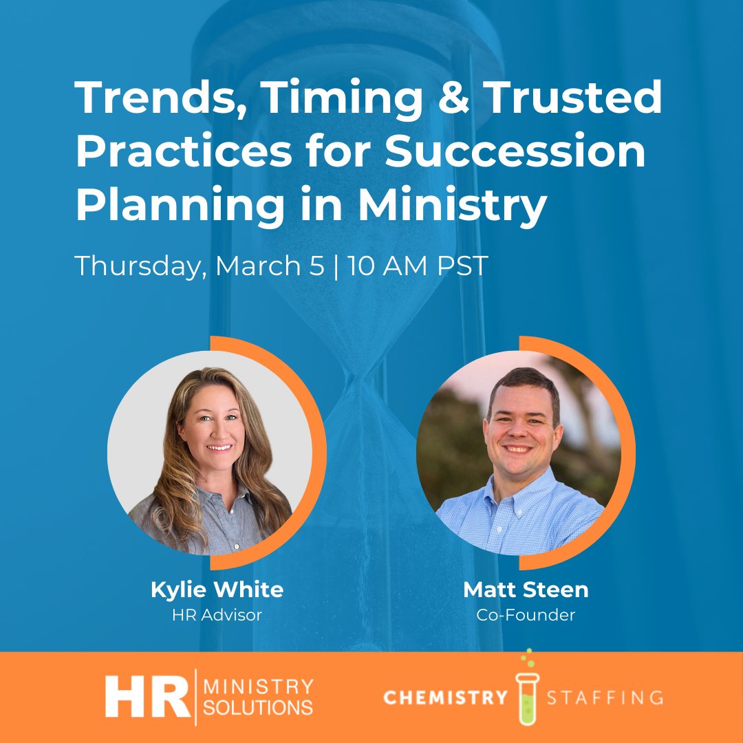 Succession planning is an important aspect of long-term health for churches and ministries, but many leaders are unsure when, how, or where to begin. Join us as we talk to Matt Steen with Chemistry Staffing about emerging trends, what to do in scenarios other than retirement, and the roles boards, HR, and leadership teams play in guiding a healthy succession process.